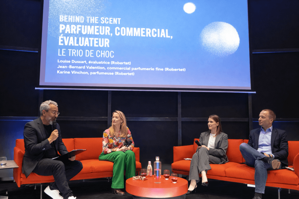 Louise Dussart, Jean-Bernard Valentino et Karine Vinchon de Robertet, y ont détaillé le travail d’équipe qui accompagne chaque projet, depuis la réception du brief client jusqu’à la présentation finale. Le commercial recueille la demande et ses enjeux, l’évaluateur la traduit en intentions olfactives et en direction créative, puis accompagne le parfumeur dans les différentes phases d’essais et d’ajustement.